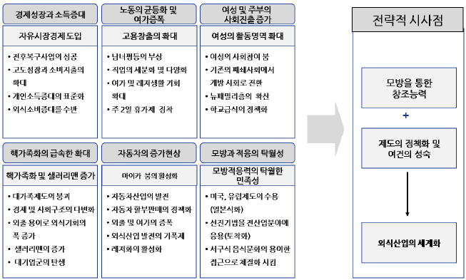타 산업과의 변화적응력 속에서 21세기 외식산업의 전략적 변신 모색 | - 외식산업의 성숙기(침체기>회복기>침체기) - 해외진출, 복합공동출점, 가격파괴, 업태전환 - 종합생활기업추구, 경영확신, 규모경제실현 |